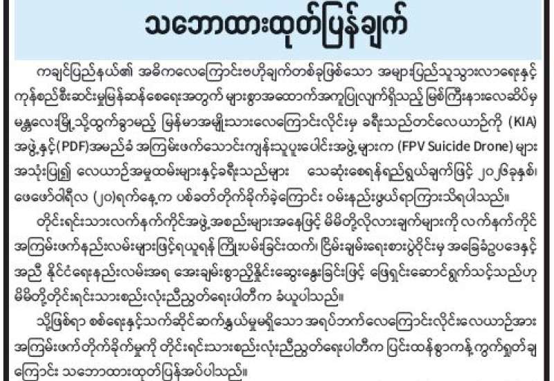 ၂၀၂၆ ခုနှစ်၊ မတ်လ (၂၇) ရက်နေ့တွင် ကျရောက်မည့် (၈၁) နှစ်မြောက် တပ်မတော်နေ့ အထိမ်းအမှတ် တိုင်းစစ်ဌာနချုပ်အဆင့် စစ်သည်တော်ကျင့်ဝတ်ပြိုင်ပွဲကို ယနေ့နံနက်ပိုင်းတွင် မြောက်ပိုင်းတိုင်းစစ်ဌာနချုပ်ရှိ ဗလမင်းထင်ခန်းမ၌ပြုလုပ်ရာ တိုင်းမှူး ဗိုလ်ချုပ် အောင်ဇော်ထွေးနှင့် တာဝန်ရှိသူများက စာမေးပွဲဖြေဆိုနေသည့် အရာရှိ၊ စစ်သည်များအား သွားရောက်ကြည့်ရှု အားပေးကြသည်။
