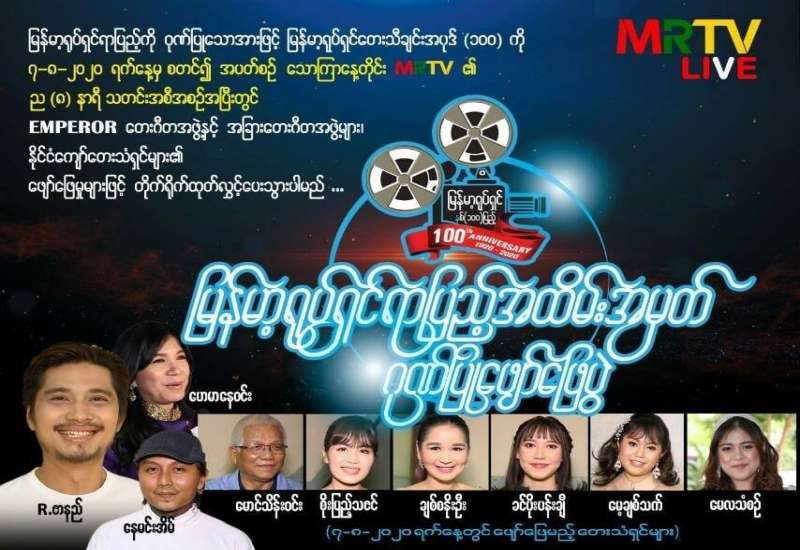 မြန်မာ့ရုပ်ရှင်ရာပြည့်ကိုဂုဏ်ပြုသောအားဖြင့် မြန်မာ့ရုပ်ရှင်တေးသီချင်း အပုဒ် (၁၀၀) ကို Emperor တေးဂီတအဖွဲ့နှင့် အခြား တေးဂီတအဖွဲ့များ၊ နိုင်ငံကျော် တေးသံရှင်များ၏ ဖျော်ဖြေမှုများဖြင့် ဩဂုတ်လ (၇) ရက်၊ သောကြာနေ့မှစတင်၍ အပတ်စဉ် သောကြာနေ့တိုင်း မြန်မာ့ရုပ်မြင်သံကြား (MRTV) ၏ ည (၈)နာရီ သတင်းအစီအစဉ်အပြီးတွင် မြန်မာ့ရုပ်မြင်သံကြား (MRTV) နှင့် MRTV Facebook Page တို့မှ တိုက်ရိုက်ထုတ်လွှင့်ပေးသွားမည်ဖြစ်သည်။