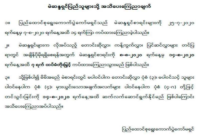 ၁။ ပြည်ထောင်စုရွေးကောက်ပွဲကော်မရှင်သည် မဲဆန္ဒရှင်စာရင်းများကို ၂၅-၇-၂၀၂၀ ရက်နေ့မှ ၇-၈-၂၀၂၀ ရက်နေ့အထိ ၁၄ ရက်ကြာ ကပ်ထားကြေညာခဲ့ပါသည်။