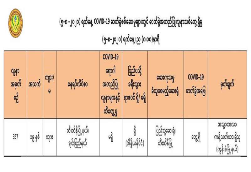 ၁။ (၅-၈-၂၀၂၀) ရက်နေ့အတွက် COVID-19 ရောဂါ ဓာတ်ခွဲစစ်ဆေးရာတွင် -
