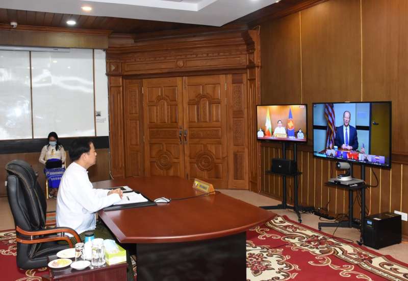 (၃၃)ကြိမ်မြောက် အာဆီယံ-အမေရိကန်ဆွေးနွေးပွဲကို ယနေ့နံနက် ၇ နာရီတွင် Video Conference စနစ်ဖြင့် ကျင်းပရာ နိုင်ငံခြားရေးဝန်ကြီးဌာန အမြဲတမ်းအတွင်းဝန် ဦးစိုးဟန် နေပြည်တော်မှ ပါဝင် တက်ရောက်သည်။
