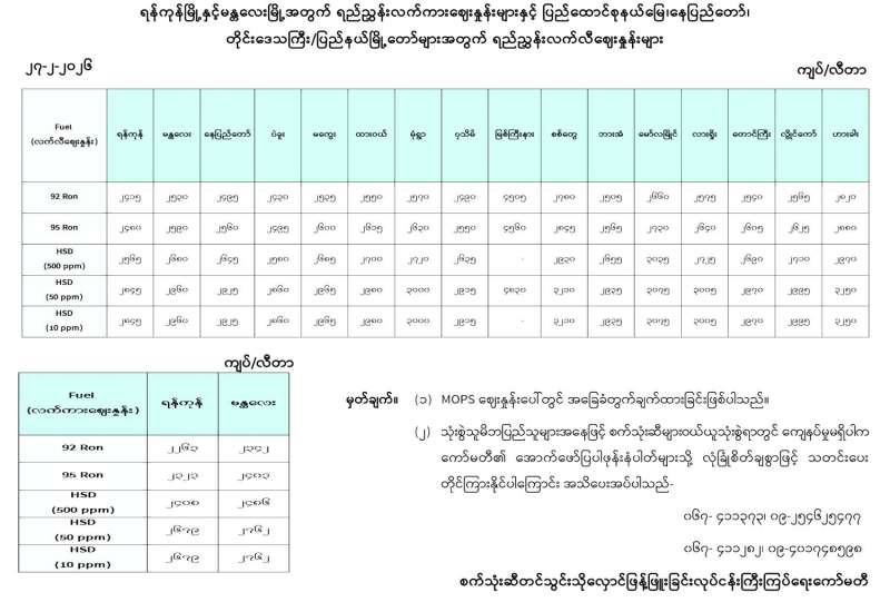 ရန်ကုန်မြို့နှင့် မန္တလေးမြို့အတွက် ရည်ညွှန်းလက်ကားဈေးနှုန်းများနှင့် ပြည်ထောင်စုနယ်မြေ နေပြည်တော်၊ တိုင်းဒေသကြီး/ပြည်နယ် မြို့တော်များအတွက် ရည်ညွှန်းလက်လီဈေးနှုန်းများ